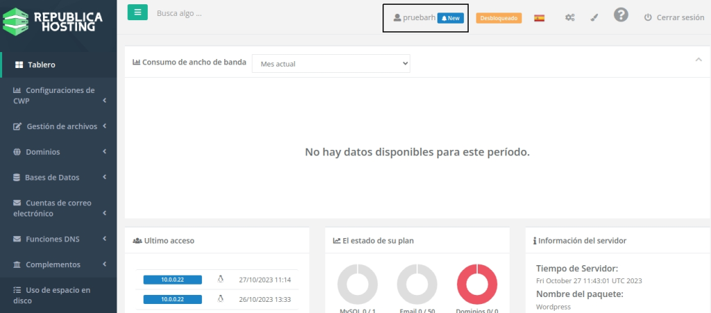Paso 1: Antes de poder cambiar la contraseña de su cuenta, primero debes acceder al panel de control de «CWP» utilizando la dirección y los datos correspondientes. Si no dispones de estos datos, puedes contactarnos en «Soporte por Ticket«. Para hacerlo, debes entrar en el área de clientes. Puedes realizar esto presionando en este enlace: https://clientes.republicahosting.com/index.php?rp=/login