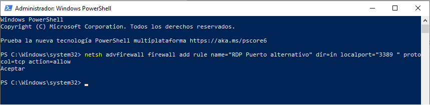 netsh advfirewall firewall add rule name=»RDP Puerto alternativo» dir=in localport=»–PUERTO–» protocol=tcp action=allow
