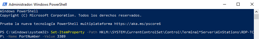 Set-ItemProperty -Path HKLM:\SYSTEM\CurrentControlSet\Control\Terminal*Server\WinStations\RDP-TCP\ -Name PortNumber -Value –PUERTO-–