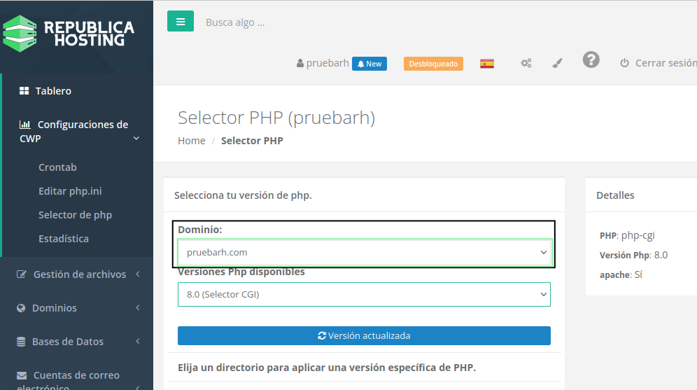 Paso 4: Una vez que hayas accedido a la sección “Selector de php”, deberás seleccionar tu dominio: