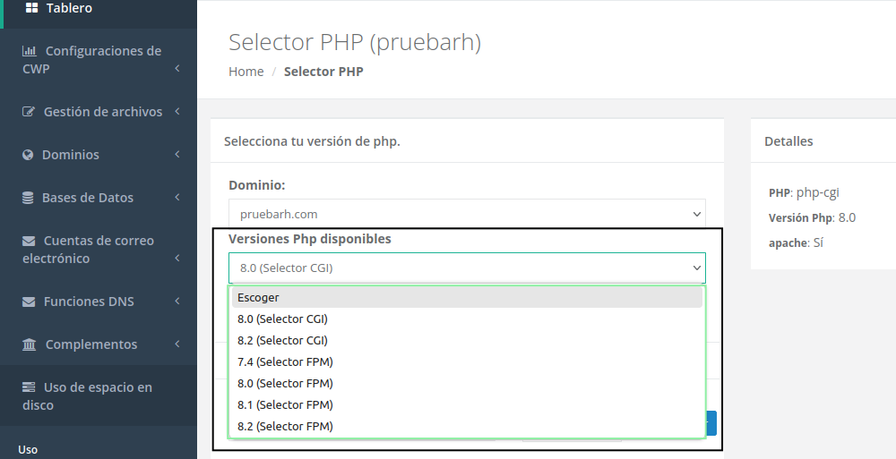 2. Ya seleccionado el dominio, se deberá repetir el mismo proceso anterior. En este caso, seleccionando el panel ubicado debajo de «Versiones php disponibles«. Aquí se escogerá la versión de php que desees.