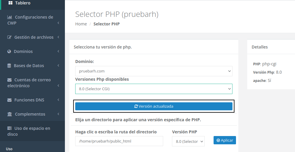 Paso 5: Una vez hecho esto, tendra que clickear en el botón «Versión actualizada« y se actualizará la versión php.