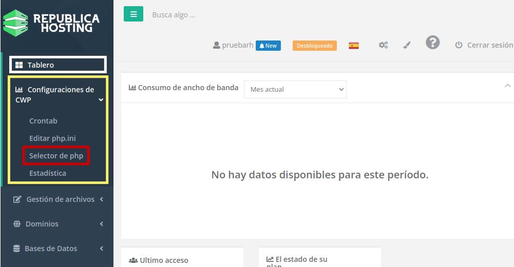 Paso 3: Una vez ingresado, te dirigirás a «Tablero«, que se encuentra a la izquierda. Dentro, harás clic en «Configuraciones de CWP«. Esto desplegará un panel, en el cual deberás hacer clic en «Selector de php«.