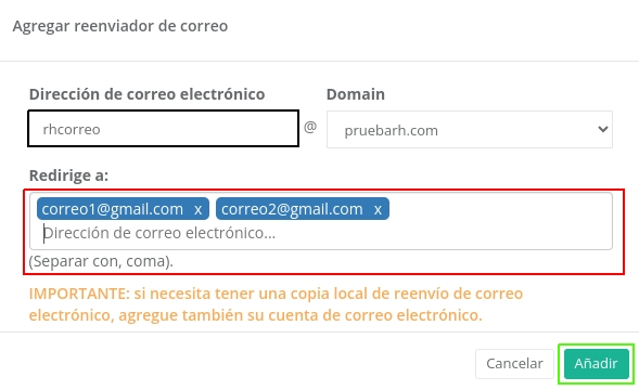 3_ En «Redirige a:«, ingresa los correos a los que deseas reenviar el mensaje. En este ejemplo, se utilizaron 2 correos («correo1@gmail.com» y «correo2@gmail.com«). Debes separarlos por comas.