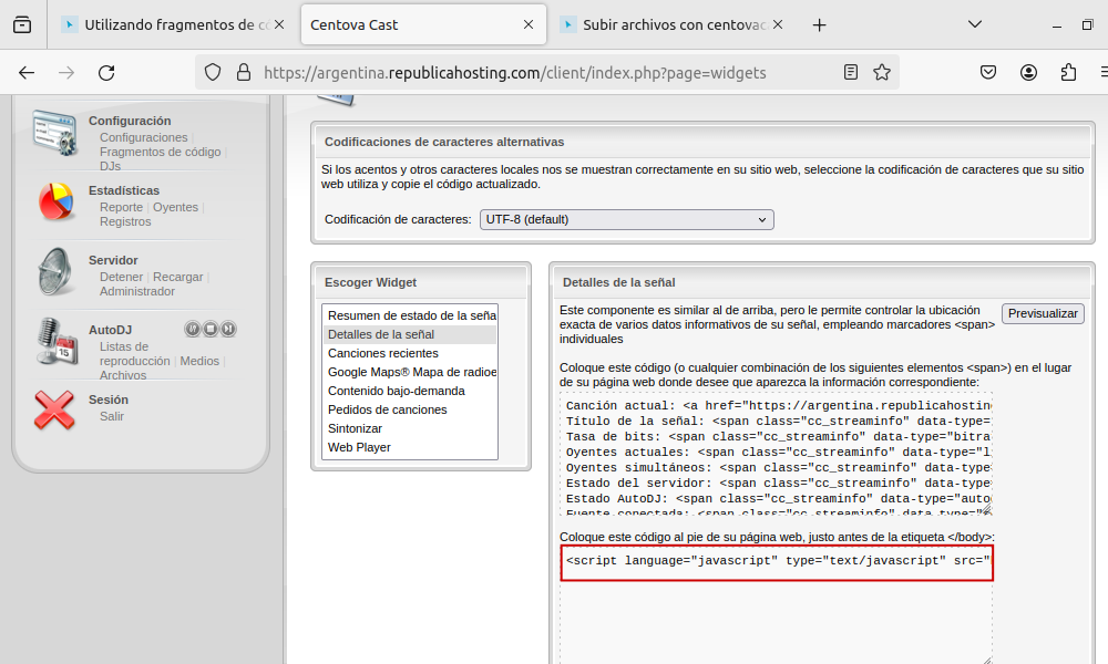 <script language=»javascript» type=»text/javascript» src=»https://servidor-centovacast:2199/system/streaminfo.js«></script>