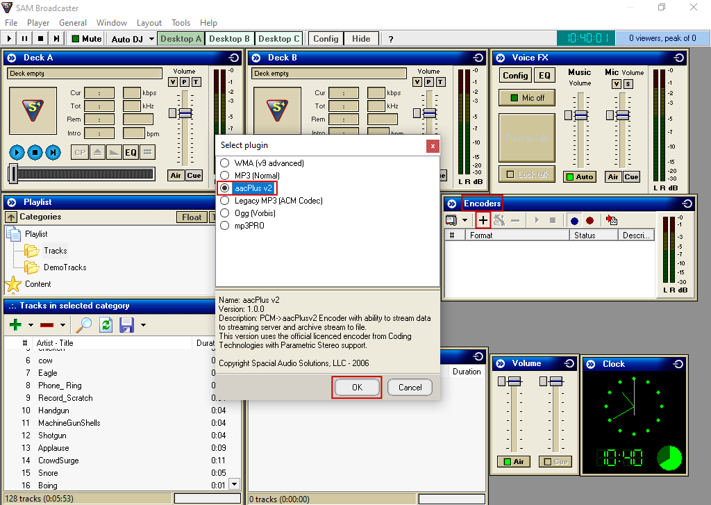 2. Dentro de la pestaña «Encoders», seleccionará el plugin «aacPlus v2», siguiente a esto presionará «OK»