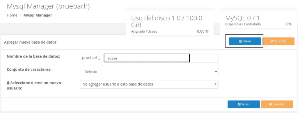 Paso 5: Para crear tu Base de datos, debes proporcionarle un nombre completando el campo «Nombre de la base de datos«. Por ejemplo, «rbase» es una opción. De esta manera, el nombre completo de la base de datos sería «sudominio_rbase«. Una vez que hayas completado esto, debes hacer clic en «Salvar«.