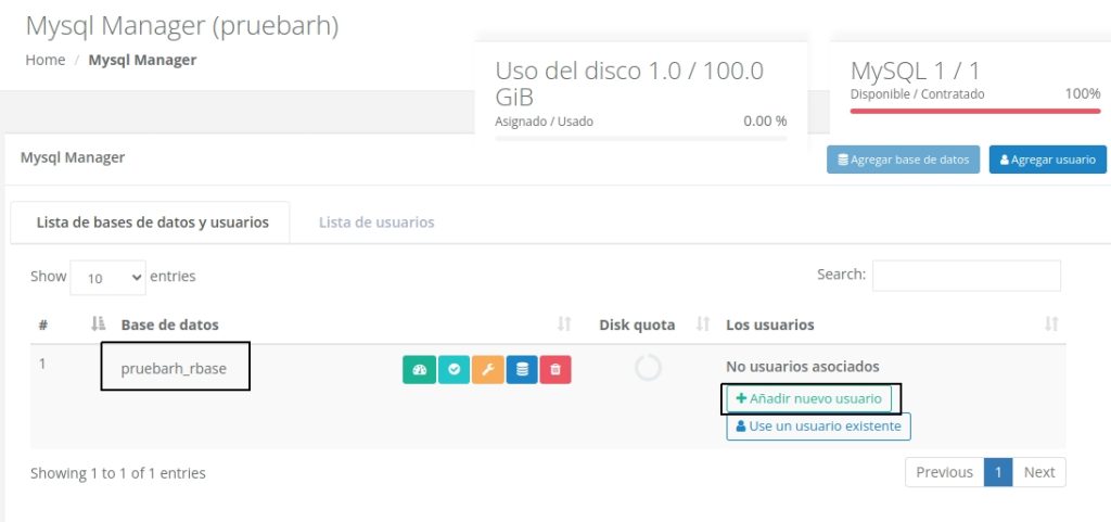Paso 6: Una vez creada tu Base de datos, tendrás la opción de crear un usuario para la misma. Para hacerlo, debes hacer clic en «Añadir nuevo usuario«. Esta opción se encuentra a la izquierda de la base de datos que previamente creaste.