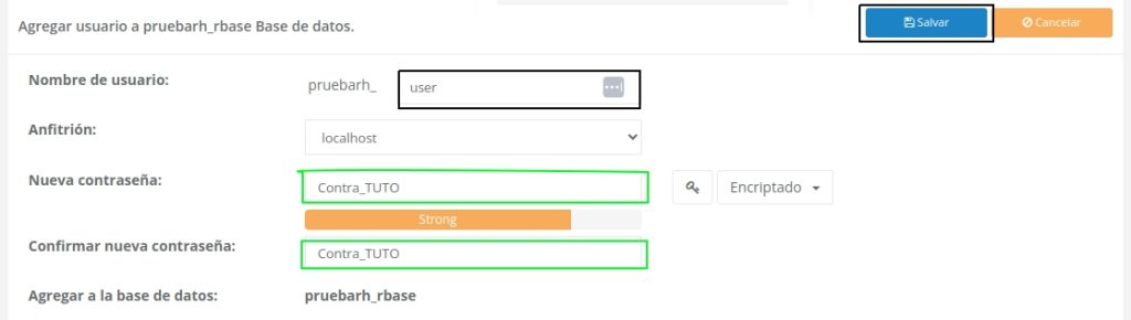 4. Para finalizar, haz clic en «Salvar» y listo, has creado un usuario para tu Base de datos.