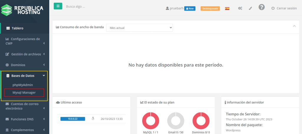 Paso 3: Una vez ingresado, te dirigirás a «Tablero«, que se encuentra a la izquierda. Dentro, harás clic en «Bases de datos«. Esto desplegará un panel, en el cual deberás hacer clic en «MySQL Manager«.