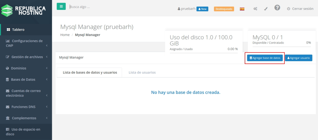 Paso 4: Una vez dentro, debes hacer clic en «Agregar Base de Datos«.