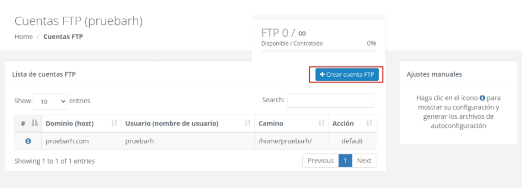 Paso 4: Una vez que hayas accedido a la sección “Cuentas FTP”, deberas seleccionar el botón «Crear cuenta FTP«.