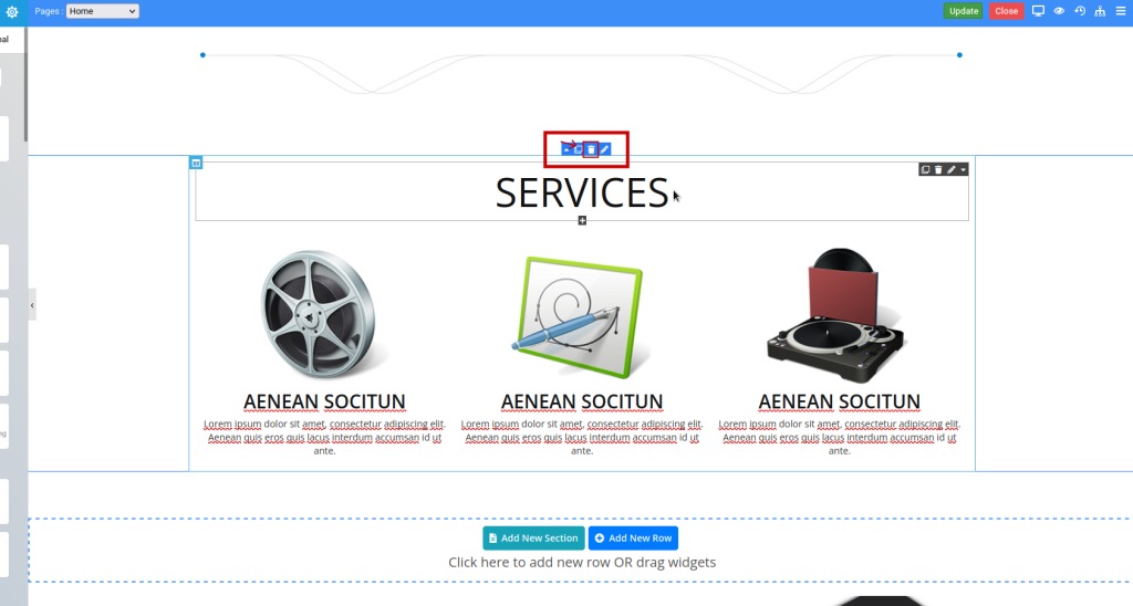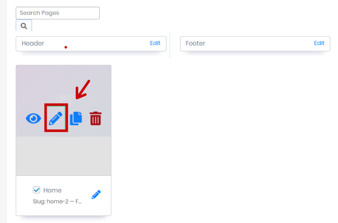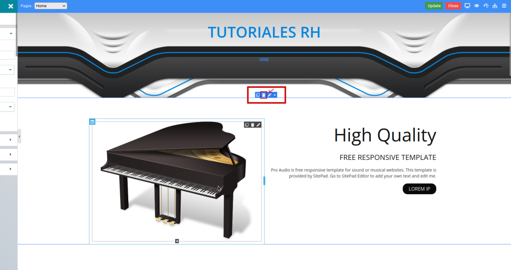 Para editar su sitio web, deberá apoyar el puntero del mouse sobre «home» y hacer clic en el icono con forma de lápiz. Como se ve en la siguiente imagen: