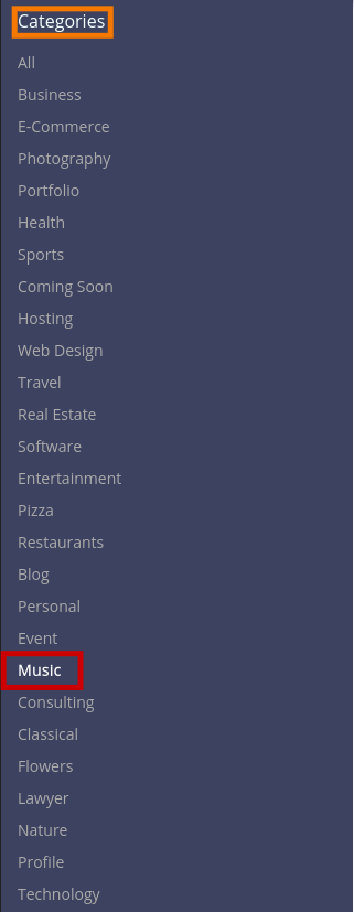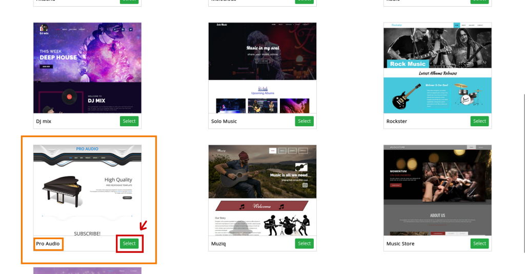 Dirigase al apartado «Music» >> «Pro audio» >> «Select» para seleccionar dicho tema. (En caso de usted seleccionar un tema/plantilla de otro apartado, el proceso de selección será el mismo)