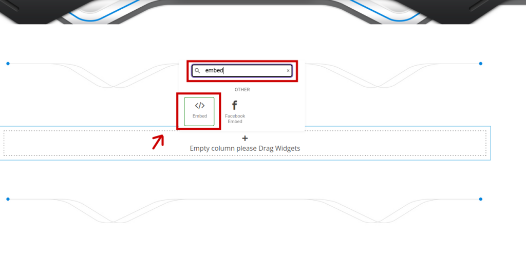 Se verá de la siguiente manera. Para poder colocar el reproductor de su Streaming de Radio/Video, deberá cliquear en el símbolo «+» que aparece en el segundo campo (el del medio) y buscar la palabra «embed«. Luego hacer clic en el símbolo como se ve en la siguiente imagen: