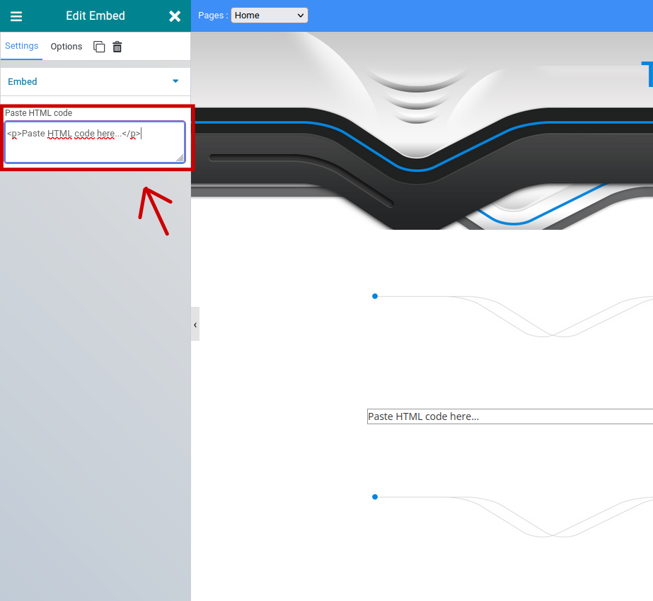 Se desplegará un menú en la esquina izquierda, donde deberá colocar el código HTML que será brindado vía ticket por soporte. De no contar con este código, puede solicitarlo.