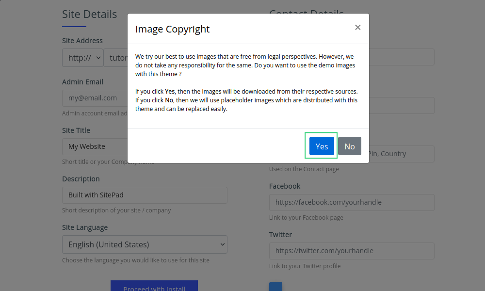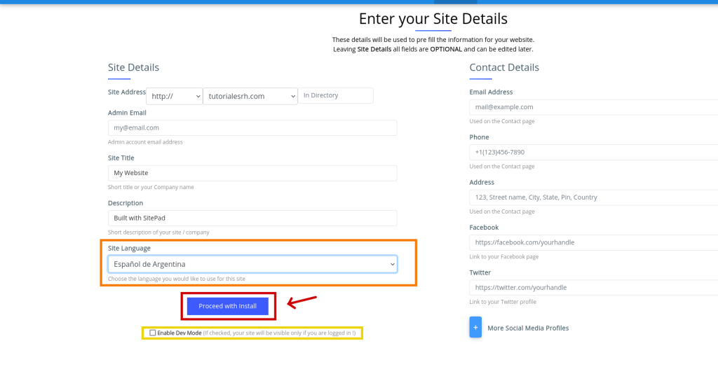 Paso 5: En la siguiente pestaña, ingresará detalles de su sitio y detalles de contacto si así lo desea, todos estos campos son opcionales y mas adelante pueden volver a ser editados. Luego, hará clic en la opción «Proceed with Install» para proceder con la instalación del tema sobre su dominio.