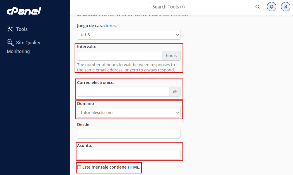 Desde: Aquí deberá colocar su propia casilla de correos, en el caso de que la autorespuesta sea enviada desde el mismo correo. O bien, puede colocar alguna cuenta adicional que presente en su dominio la cual se encargue de realizar la autorespuesta. Se suele utilizar por lo general, auto-reply@sudominio.com, info@sudominio.com, etc. (Una casilla que le recuerde al receptor que es una autorespuesta)