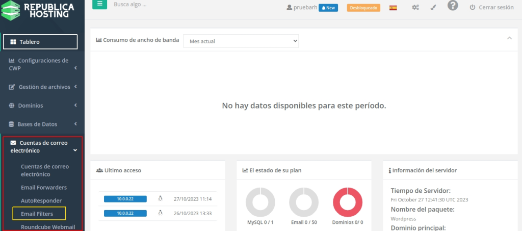Paso 3: Una vez ingresado, te dirigirás a «Tablero«, que se encuentra a la izquierda. Dentro, harás clic en «Cuentas de Correo Electrónico«. Esto desplegará un panel, en el cual deberás hacer clic en «Email Filters«.