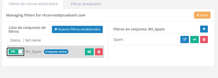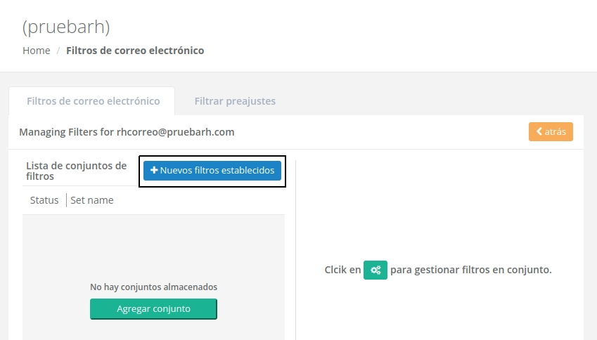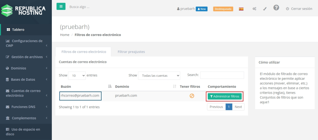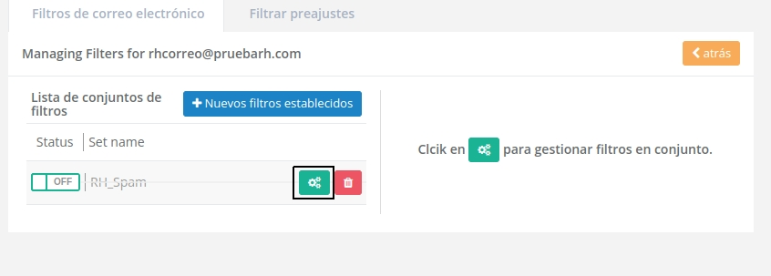 Paso 4: Una vez hayas ingresado en «Email Filters«, dentro de «Buzón» se encontrará tu correo electrónico, en este caso, «rhcorreo@pruebarh.com» es un ejemplo. Cuando localices tu cuenta, al costado aparecerá la opción «Administrar Filtros» y deberás hacer clic en esa opción.