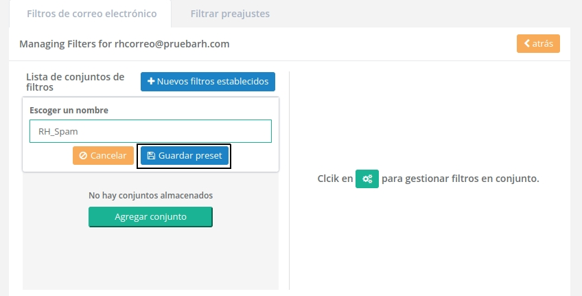 Paso 6: Una vez hayas hecho clic en «Nuevos filtros establecidos«, se desplegará un panel en el cual deberás darle un nombre al conjunto de filtros en «Escoger un nombre«. Esto creará un conjunto que albergará todos los filtros que desees. En este caso, «RH_Spam» es un ejemplo. Por último, deberás hacer clic en «Guardar Preset«.