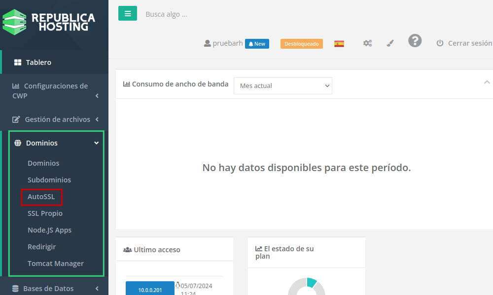 Paso 3: Una vez ingresado, te dirigirás a «Tablero», que se encuentra a la izquierda. Dentro, harás clic en «Dominios». Esto desplegará un panel, en el cual deberás hacer clic en «AutoSSL».