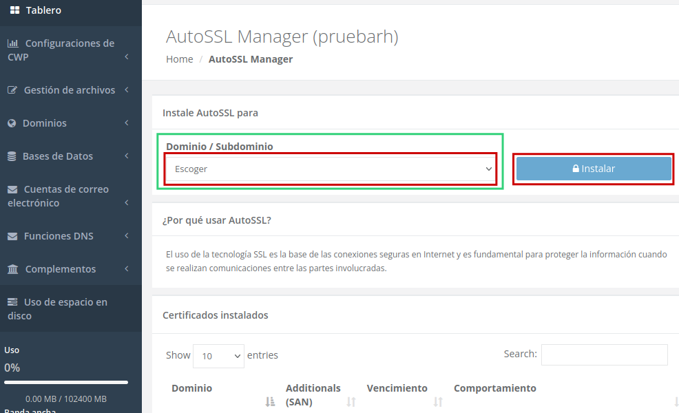 Paso 4: Dentro de «AutoSSL», deberá elegir su dominio dentro de «Dominio / Subdominio». Luego, deberá marcar la opción «Instalar».
