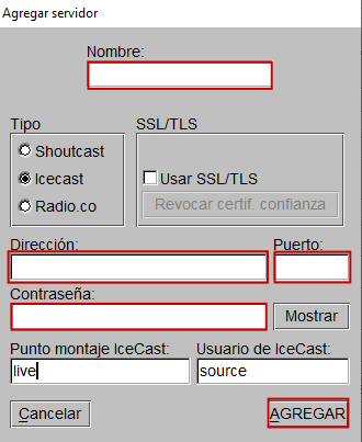 2. En «Tipo» colocará «Icecast».