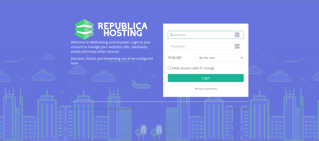 Paso 1: Antes de poder modificar la memoria limite en WP, primero debes acceder al panel de control de «CWP» utilizando la dirección y los datos correspondientes. Si no dispones de estos datos, puedes contactarnos en «Soporte por Ticket«. Para hacerlo, debes entrar en el área de clientes. Puedes realizar esto presionando en este enlace: https://clientes.republicahosting.com/index.php?rp=/login