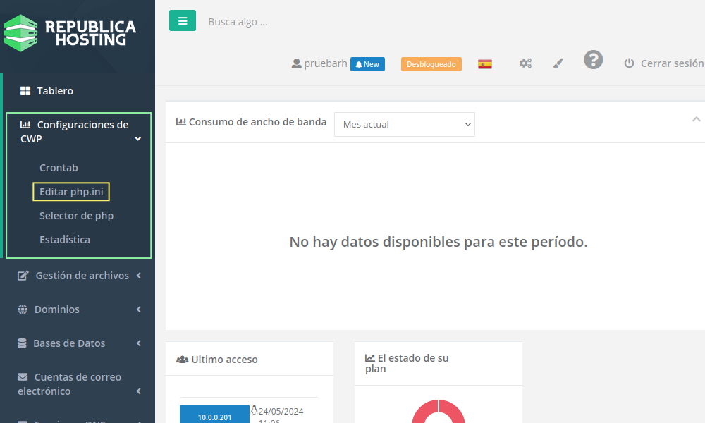 Paso 3: Una vez dentro, te dirigirás a «Tablero«, en el apartado de «Configuraciones de CWP» harás clic en «Editar php.ini«.
