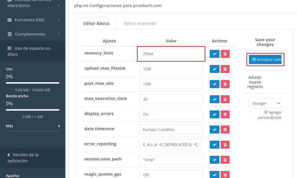 Paso 4: Al ingresar se dirigirá a »memory_limit» y colocara 256M ya que es el limite de memoria recomendado. Luego, hará clic en «Actualizar cambios« para guardar la configuración previamente colocada.